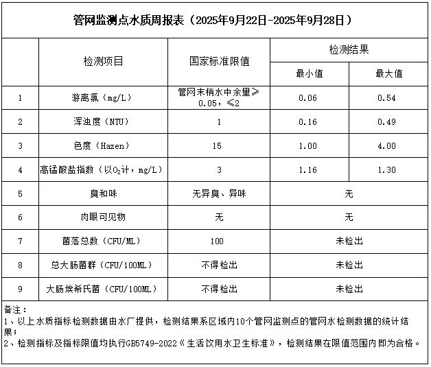 管網監測點水質周報表(2025年9月22日-2025年9月28日)