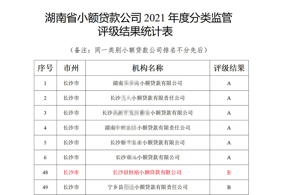 被湖南省金融辦監(jiān)管評級為B級資質(zhì)單位。